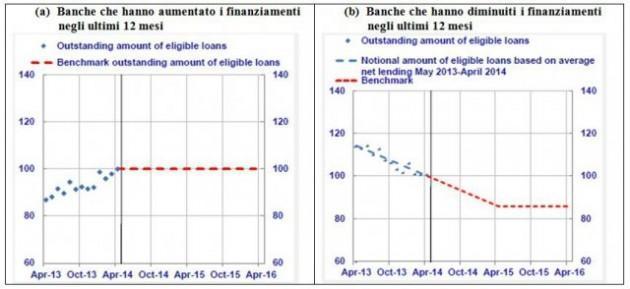 Il primo benchmark riguarda le banche che negli ultimi dodici mesi hanno aumentato lo stock di finanziamenti erogati al settore non finanziario (grafico 1a). Per questa tipologia di istituti sarà sufficiente mantenere l’ammontare di impieghi invariato nel periodo compreso tra aprile 2014 e aprile 2016 per rispettare gli impegni e garantirsi il finanziamento agevolato fino alla scadenza del settembre 2018.