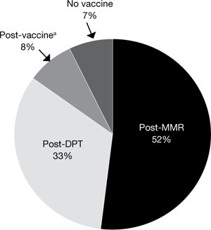 Fig. 1 – Distribuzione dei casi di autismo da vaccino secondo relazioni giunte da 152 famiglie (DPT: difterite-pertosse-tetano; MMR: morbillo-parotite-rosolia; *: non identificato)