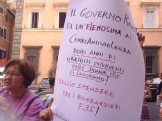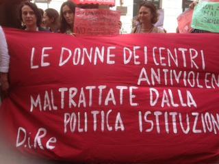 Le donne dei centri antiviolenza maltrattate dalla politica istituzionale è stato lo slogan della nostra protesta, quando il 10 luglio scorso siamo andate a Roma per i centri antiviolenza. Dopo la conferenza stampa alla Camera, organizzata da Celeste Costantino, siamo andate in via della Stamperia davanti alla sede della Conferenza Stato-Regioni che votava il riparto dei fondi per le donne vittime di violenza. Quello che assegna tremila euro l’anno ai centri per “salvarli” dalla chiusura, quello che equipara i centri antiviolenza istituzionali a quelli delle organizzazioni non governative. I fondi saranno distribuiti (quei pochi che ci sono) al movimento per la vita, alle comunità madre bambino, agli sportelli per inserimento lavorativo di donne, ai luoghi di conciliazione familiare e in alcune regioni, come il Piemonte, saranno esclusi alcuni dei centri antiviolenza aderenti a D.i.Re.