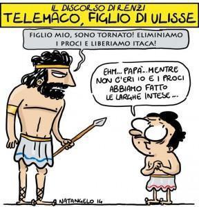 Se avesse immaginato ad attenderlo nella nativa Itaca un Telemaco di renziane fattezze, giovane uomo dall’accento fiorentino e dalla pedante vocina bambinesca, forse Ulisse non si sarebbe dato tanto pensiero e se ne sarebbe rimasto con la bella ninfa Calipso a Ogigia vita natural durante. Ma la fantasia ci lascia immaginare che il Telemaco originale avesse poco a che vedere con quello che oggi corre senza sosta tra il litorale di Palazzo Chigi, quello di Palazzo Madama, quello del Quirinale e quello del Nazareno al grido di “Riforme o morte”.