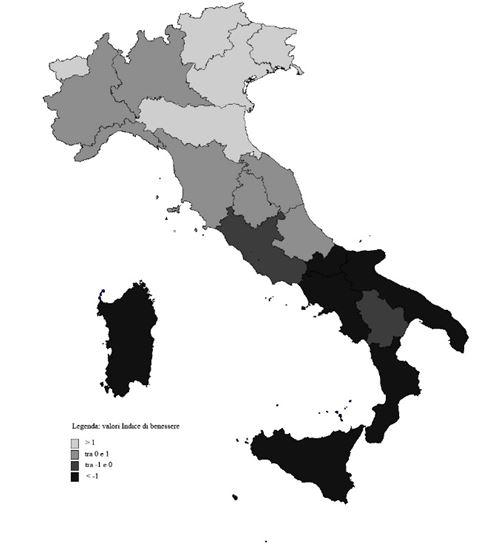 Per rispondere a queste domande, in uno studio empirico (abbiamo utilizzato la banca dati Istat sul Bes) abbiamo calcolato per dieci dimensioni del benessere (cultura e tempo libero, istruzione; lavoro; ambiente; servizi pubblici essenziali; salute; condizioni materiali di vita; sicurezza personale; ricerca e innovazione; relazioni sociali) il rispettivo indicatore sintetico per gli anni 2004-2010, attraverso un’analisi statistica in componenti principali basata su un insieme di 57 variabili a livello regionale. Usando gli indici sintetici come nuove variabili, abbiamo anche costruito, con la stessa metodologia, un indicatore complessivo di benessere per ciascuna Regione italiana.