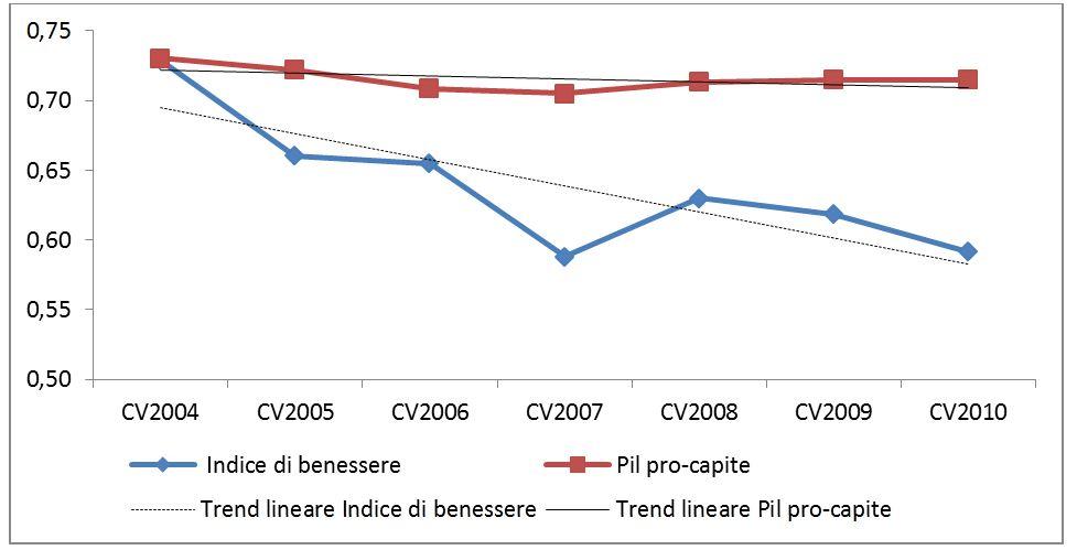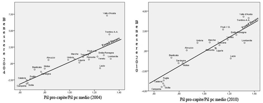 I risultati evidenziano una forte correlazione lineare positiva tra il Pil pro-capite e l’indice di benessere complessivo delle Regioni. La figura 2 mostra che le Regioni che all’inizio del periodo associano bassi livelli di Pil pro-capite a ridotti livelli di benessere complessivo, così come quelle che vantano sia alti valori di Pil pro-capite che elevati standard di benessere, sono le stesse nel 2010.