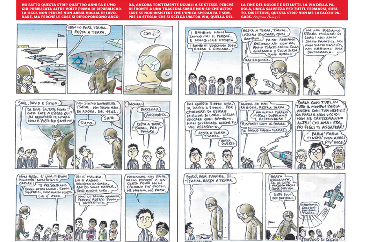Ho fatto questa strip quattro anni fa e l’ho già pubblicata altre volte prima di oggi. Non perché non abbia voglia di lavorare, ma perché le cose si ripropongono ancora, ancora tristemente uguali a se stesse. Perché di fronte a una tragedia simile non so che altro fare se non insistere che l’unica speranza è sempre la stessa: che si scelga l’altra via, quella della fine del dolore e dei lutti. La via della parola, unica salvezza per tutti. Fermarsi subito. Direttore, questa strip non me la faccio pagare.