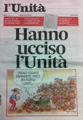 In prima pagina, un titolo a caratteri cubitali: ‘Hanno ucciso l’Unità’. A corredo a una citazione del fondatore del quotidiano: “Dovrà essere un giornale di sinistra. Io propongo come titolo l’Unità puro e semplice che sarà un significato per gli operai e avrà un significato più generale”. A fondo pagina una vignetta di Staino: Bobo, che, finito sotto un muro di mattoni crollato, dice alla figlia ‘Speravo fossero emendamenti, invece era proprio l’Unità…’. Gli unici testi sono a pagina due e tre: l’editoriale di Landò, il comunicato del Comitato di redazione e la cronaca della giornata di ieri, nella quale l’assemblea dei soci è arrivata alla decisione finale, con le reazioni “dal Pd alla Cgil, dalla Fnsi ai lettori” alla notizia della chiusura.