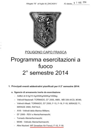 Il documento non specifica le date della trasferta israeliana, ma lo Stato Maggiore della Difesa e l’Aeronautica Militare confermano la presenza programmata dell’aviazione israeliana in Sardegna per l’annuale esercitazione bilaterale “Vega” che solitamente si tiene tra ottobre e novembre con base all’aeroporto militare di Decimomannu (Cagliari), da cui dipende il campo di bombardamento di Capo Frasca.