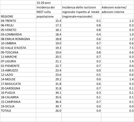 La tabella che segue contiene alcuni indicatori, il tasso dei Neet, cioè dei giovani che non studiano e non lavorano (il target della garanzia giovani), il tasso di adesione al portale regionale rispetto a quello nazionale (possibile indicatore dell’efficacia della presenza dell’amministrazione regionale) e il rapporto tra adesioni esterne e interne (un possibile indicatore di attrattività relativa).