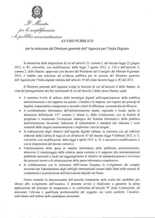 Ora la spinosa questione pare sia finita sul tavolo del premier Renzi. Per il quale, dopo aver annunciato con enfasi, lo scorso 12 luglio “il Cdm ha dato l’ok al ministro Madia sull’agenzia digitale […] e nell’arco dei prossimi giorni Alessandra Poggiani diventerà il direttore generale dell’agenzia digitale”, non sarà facile tornare sui propri passi. Garantendo così “la piena applicazione del principio di trasparenza” a cui lo stesso avviso di selezione fa espresso riferimento.