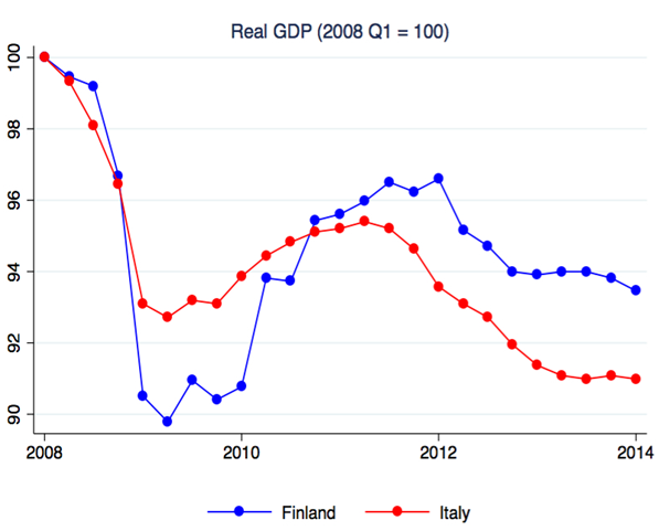 Abbiamo costruito un grafico che mostra la performance del Pil italiano a confronto con quello finlandese (normalizzato a 100 nel primo trimestre 2008). La Finlandia è parte dell’area dell’euro. Rispetto all’Italia, il Pil finlandese si contrae di più all’inizio della crisi, recupera sull’Italia fino al 2012. Da lì in poi, il Pil dei due paesi è di nuovo in discesa. A nostro parere, il grafico solleva un quesito chiaro. O l’andamento del Pil in Finlandia e in Italia è dovuto a fattori della struttura produttiva comuni a entrambi i paesi (difficili però da trovare, se si esclude la vicenda di Nokia, riflesso della crisi delle multinazionali europee dell’high tech di fronte all’espansione di quelle coreane), oppure l’attuale congiuntura in Europa (le cui performace di crescita sono previste ben al di sotto di quelle degli Stati Uniti) è legata a questioni cicliche (o di grande stagnazione) e insufficienza della politica economica di stabilizzazione.