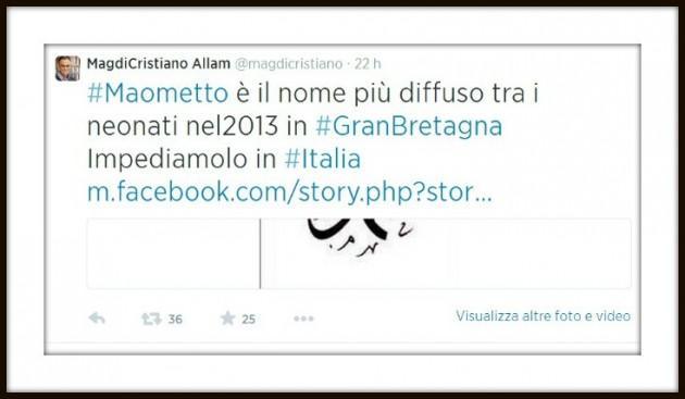Spaventato dall’avanzata dei nomi e cognomi stranieri è Magdi Cristiano Allam. Il giornalista, politico e scrittore egiziano naturalizzato italiano, sul suo profilo Twitter ha scritto: “Maometto è il nome più diffuso tra i neonati nel 2013 in Gran Bretagna. Impediamolo in Italia”.