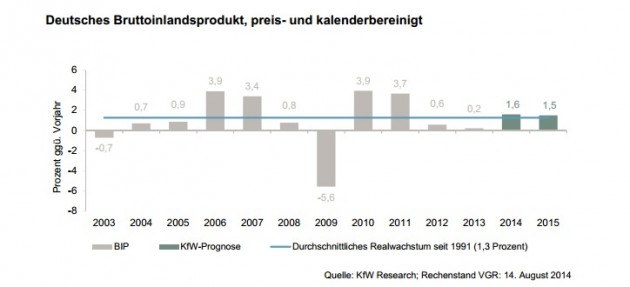 Dopo la frenata del pil dello 0,2% registrata nel secondo trimestre, ancora cattive notizie per l’economia tedesca. La banca pubblica d’investimenti KfW ha rivisto al ribasso le stime di crescita del prodotto interno lordo nazionale: per l’anno in corso gli analisti di Kfw, omologa della Cassa depositi e prestiti, prevedono un aumento dell’1,6% invece del 2% annunciato precedentemente. Nel 2015, invece, la crescita del pil si fermerà, all’1,5% invece dell’1,6% pronosticato a maggio dalla stessa banca.