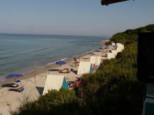 Ci si arriva con una stradina asfaltata da poco che serpeggia su colline verdissime tra mucche e macchia mediterranea. Solo gli ultimi metri sono sterrati. Ecocamping Atlantid, pochi chilometri a nord di Durazzo è l’ avamposto della controtendenza, il laboratorio di una possibile gestione sostenibile del soggiorno al mare sulla costa adriatica dell’Albania. Direttamente sulla spiaggia, come non capita mai. Solo i più arditi dei camping più liberi oserebbero piantar le tende a così pochi metri dal mare come lo sono le splendide e alte tende di cotone (“biologico”) chiaro che si trovano già pronte con materassini di gomma piuma. I gestori sono certi che il mare d’estate non sale mai abbastanza per bagnare le tende. Per i più prudenti (come siamo stati noi, appena il mare si è mosso un po’) ci sono tende poco più in alto, con una gran vista. E’ su una spiaggia di sabbia lunghissima, poco frequentata, con acqua limpidissima. A poca distanza, sul promontorio, ci sono i resti di un Castello e una chiesetta romanica. L’impegno ecologico del camping aperto dai giovani dell’associazione Tirana Express si nota in vari particolari come le tenui luci notturne alimentate da pannellini solari, i prodotti a chilometro zero usati in cucina (per ora invece non ci sono alternative ad accendere il gruppo elettrogeno per qualche ora al mattino e alla sera).