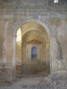 Spingendosi in direzione delle strutture superstiti, sulla spianata superiore, tra i cipressi la vegetazione è in molti mesi dell’anno florida. Entrare nella chiesa grande è agevole. Molto più difficoltoso spiegarsi perché affreschi e stucchi continuino a rimanere in quelle condizioni. In più punti minacciando di cadere a terra, in altri avendolo già fatto. Non di rado, danneggiati anche dagli autografi lasciati da alcuni dei turisti arrivati fin quassù. D’altra parte la struttura stessa sembra essere in un precario stato. Come indiziano le tante lesioni che si leggono lungo le pareti e i crolli del pavimento in diversi punti. Addentrandosi lungo il corridoio centrale si cammina su un irregolare tappeto di materiali crollati. A parte rare occasioni il castello è frequentato da pochi. Oltre ai raccoglitori di more. Ed è un peccato. Anche se naturale conseguenza di una poco efficace pubblicizzazione del complesso. Segnalato lungo la strada che conduce a San Severino Marche. Ma senza supporti informativi in loco. Eppure nelle immediate vicinanze del castello ci sarebbe anche dell’altro.