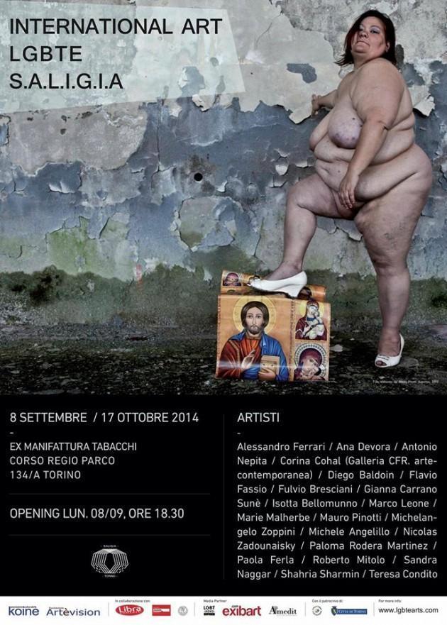 E’ polemica a Torino per una foto-scandalo utilizzata per promuovere una mostra organizzata dal movimento per la libertà omosessuale Lgbt, patrocinata dal Comune. Nella locandina della Mostra Internazionale d’Arte Lgbte “La Grande Battaglia Trova Esito“, compare l’immagine di una donna grassa e nuda che calpesta un’immagine religiosa. Immediate le reazioni del centrodestra torinese. Maurizio Marrone, capogruppo in consiglio comunale per Fratelli d’Italia, sul porpio sito ha postato un commento indignato: “Una obesa nuda che calpesta le immagini di Gesù Cristo e della Vergine Maria: ecco la nuova frontiera dell’arte omosessuale che il comune di Torino ha ritenuto di voler promuovere” e, continua: “E’ questo il rispetto e la cultura dimostrati da quel mondo gay sempre pronto a piangere nel circo mediatico il proprio vittimismo, pretendendo di introdurre il reato di omofobia? la sinistra davvero intende inseguire l’associazionismo omosex in questa ultima inaccettabile provocazione?”.