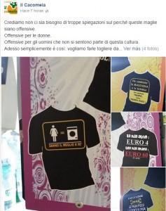 La buona notizia: grazie alla segnalazione in rete e sui social network, tra le altre, dell’associazione Il Cacomela che promuove sulle alture di Modena una scuola autogestita libertaria per bambine e bambini delle elementari, la Società autostrade ha provveduto a far rimuovere da un autogrill nella zona di Anagni, una collezione di magliette sessiste diffuse in molte altre stazioni di servizio.