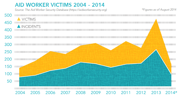 “L’anno 2013 ha registrato un aumento del 66% nel numero di vittimedal 2012, con 251 attacchi, 460 operatori umanitari colpiti di cui 155 uccisi, 171 gravemente feriti e 134 rapiti. Il picco di attacchi nel 2013 è stata trainato principalmente dai crescenti conflitti e il deterioramento della governance in Siria e Sud Sudan. La maggioranza delle vittime erano membri dello staff di Ong nazionali e della Croce Rossa –Mezzaluna”.