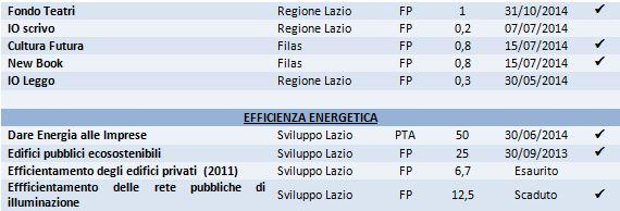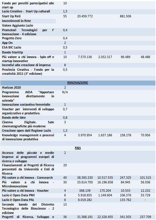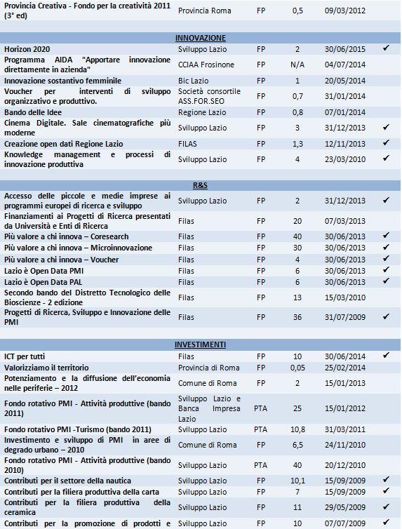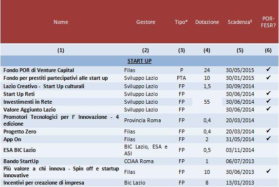 La colonna 1 mostra il nome di ciascun programma. La colonna 2 mostra l’ente finanziatore e/o gestore dei vari programmi. La maggioranza dei programmi è gestita da tre finanziarie, Sviluppo Lazio, Filas e BicLazio, possedute interamente o quasi dalla Regione. Recentemente è stato deciso che le ultime due verranno incorporate in Sviluppo Lazio; ma continueranno a gestire i bandi originariamente indetti, fino ad esaurimento. Alcuni bandi verranno probabilmente accorpati: le nostre tabelle riflettono la situazione al 16 settembre 2014. Si noti che molti programmi sono finanziati e/o gestiti anche da provincie, comuni, camere di commercio, e altre entità.