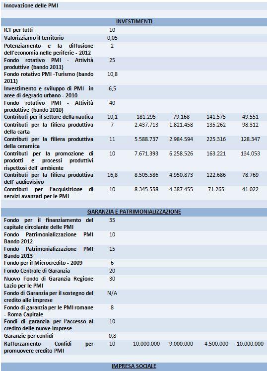 Quale che sia la ragione, la Tabella 1 sembra indicare un enorme numero di iniziative e programmi. Sembra che ogni assessorato, ogni provincia, ogni Camera di Commercio, e ovviamente le tre finanziarie, abbiano bisogno di uno o più programmi per finanziare “idee innovative” e per le PMI. Così, nell’ultima infornata per spendere i fondi rimasti, vediamo un “Bando delle Idee” della regione Lazio, con una dotazione di 820.000 Euro e importo massimo per progetto di 20.000 Euro; un “Contributo a fondo perduto sotto forma di voucher per sostenere interventi di sviluppo organizzativo e produttivo”, con una dotazione di 720.000 Euro e importi massimi per progetto di 12.000 Euro; il programma “Valorizziamo il territorio” della Provincia di Roma, con una dotazione totale di 50.000 Euro; un “Contributo a fondo perduto per favorire la crescita delle imprese sui mercati internazionali.” della Camera di Commercio di Frosinone, con una dotazione totale di 150.000 euro; i programmi “Io leggo” e “Io scrivo” della Regione Lazio, con dotazioni di 300.000 e 200.000 Euro, rispettivamente, per promuovere il libro; il “Progetto Zero” della Filas, per finanziare startup, con una dotazione di 400.000 Euro.