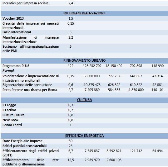 Fonti: colonna (2): vedi file Excel; colonne (3) e (4): OpenCoesione; colonne (5) e (6): regione Lazio