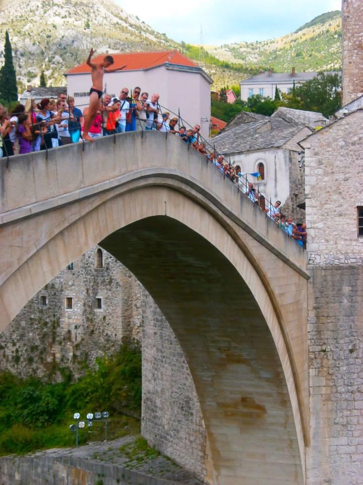Cominciamo con il quartiere est (musulmano) dalla Kajtaz, tradizionale casa turca risalente al 1600, proseguendo verso il ponte entriamo nella moschea (koski mehmed pasha) il cui minareto sovrasta il paese e saliamo sulla cima di questo per godere del più bel panorama sul ponte che si possa avere a Mostar. Facciamo l’esperienza dell’affollatissimo bazar, con orde di turisti che affollano le strette stradine su cui si affacciano i negozi di souvenir e raggiungiamo finalmente il famoso e magnifico Stari Most, il ponte che collega la parte est con quella ovest della città (rispettivamente musulmana e cristiana). Neanche volendolo fare di proposito saremmo riusciti ad arrivarci nel momento dell’Athan, l’appello alla preghiera proveniente dai vari minareti della zona che riecheggia nell’etere in un paesaggio incantevole rendendo l’atmosfera ancora più suggestiva.