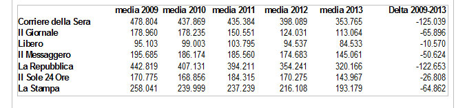Se però contestualizziamo i dati degli ultimi mesi in un arco temporale più ampio, il quadro che ne esce è davvero drammatico. Perché La Stampa, La Repubblica, Corriere, Il Sole 24 Ore hanno perso, nel periodo 2009-2013, complessivamente quasi 340mila copie: rispettivamente 64.862, 122.653, 125.039 e 26.808.