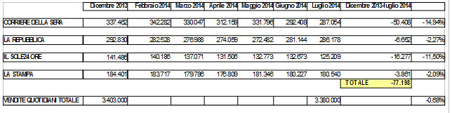 “Solo” 6600 e 3800 copie sono stati i patrimoni dissipati rispettivamente da La Repubblica e da La Stampa. In quest’ultimo caso le vendite, che a dicembre 2013, erano pari a 184mila copie, sono state a luglio pari a 180mila (-2,09%). E per il quotidiano fondato da Eugenio Scalfari il calo di vendite è stato del 2,27%; cosicché da 292mila si è arrivati a quota 286mila copie.