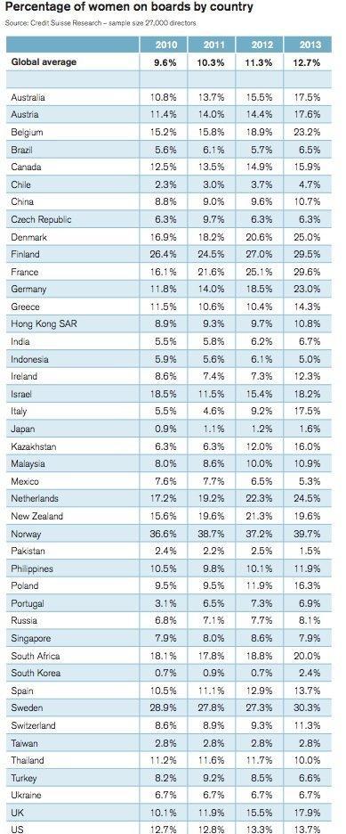 Nella elaborazione del Credit Suisse Research Institute spicca invece una buona notizia per l’Italia, perché le donne nei consigli di amministrazione, dal 2010 al 2013, sono triplicate, balzando dal 5,5 al 17,5% del totale dei componenti degli organi di amministrazione analizzati. Siamo ancora lontani dai valori della Francia (29,6%) ma avanti rispetto al dato della Spagna e degli Stati Uniti (13,7%), in linea con quello della Gran Bretagna (17,9%) e non ci dividono che 5,5 punti dalla percentuale della Germania (23%).