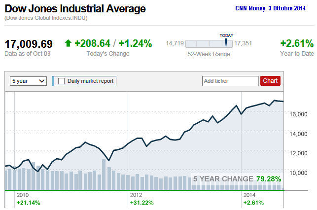 In America, dove ciascuno è praticamente costretto ad arrangiarsi da solo ad accantonare i suoi risparmi per garantirsi una pensione, l’investimento in borsa è cosa cui praticamente tutti si devono piegare, spesso anche senza volerlo, perché in un modo o nell’altro quasi tutti i risparmi finiscono là. Ma l’investimento in borsa comporta sempre dei rischi, anche forti. Il barometro della borsa infatti è posizionato ora ad un livello che non può lasciar dubbi: la tempesta è vicina! Il “barometro” della borsa pero’ non segna tempesta quando è al minimo, come fanno i barometri atmosferici, ma al massimo, come sono attualmente i livelli dei principali indicatori dei titoli quotati: lo S&P 500, il Dow Jones e il Nasdaq, che sono infatti tutti posizionati sui valori massimi degli ultimi 5 anni (vedasi tabelle di Cnn-Money del 3 ottobre).