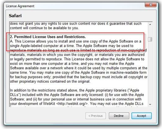 3. Per circa 6 mesi (prima che un legale se ne accorgesse) l’Eula di Safari per Windows vietava espressamente di installarlo su Windows