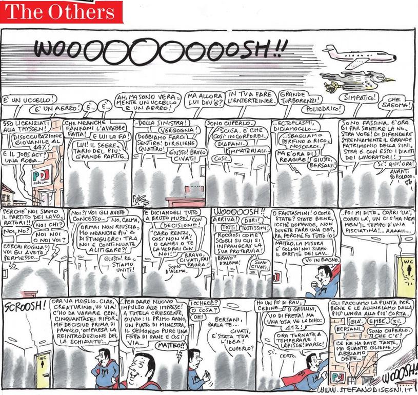 Nel Pd non manca chi si oppone a Matteo Renzi. Pippo Civati, Pier Luigi Bersani e Gianni Cuperlo non esitano a criticare il Jobs Act per difendere i diritti dei lavoratori, il “grande patrimonio della sinistra”. Ma quando arriva in assemblea il presidente del Consiglio, supereroe coi minuti contati, tutti si fanno zitti.