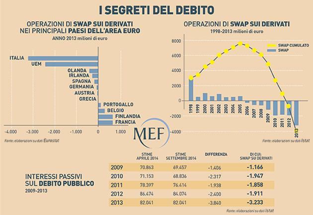 Gli Swap e i Fra sono più conosciuti come strumenti derivati, quelli di cui hanno fatto largo uso i governi che si sono succeduti a partire dal 1998, come pure alcune amministrazioni locali. Nella pancia del ministero del Tesoro dovrebbero esserci derivati sul debito pubblico per circa 160 miliardi di euro, circa il 10 per cento dei titoli di Stato, come ebbe a dichiarare nel 2012, in risposta a una interrogazione parlamentare, l’allora sottosegretario Marco Rossi Doria (governo Monti): 100 miliardi sono interest rate swap, 36 miliardi cross currency swap, 20 swaption e 3,5 miliardi swap ex ISPA. Seppure nei primi otto anni le finanze pubbliche abbiano beneficiato di quasi 8 miliardi di guadagni grazie ai derivati, a partire dal 2006 la tendenza si è invertita e le perdite sono state sempre più consistenti.