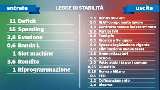 Sul fronte delle coperture 11 miliardi arrivano dall'aumento del deficit dal 2,2% al 2,9%, 3,8 dal recupero dell'evasione e 15 miliardi dalla spending review, di cui 6 dai risparmi dello Stato, 4 dalle Regioni, 1,4 dai Comuni e 1 dalle Province. Le uscite vanno per 9,5 miliardi alla stabilizzazione del bonus di 80 euro, per 5 a tagliare l'Irap per le imprese e per 1,9 ad azzerare per tre anni i contributi per i nuovi assunti con contratto a tempo indeterminato. 800 milioni destinati agli autonomi con redditi inferiori a 15mila euro