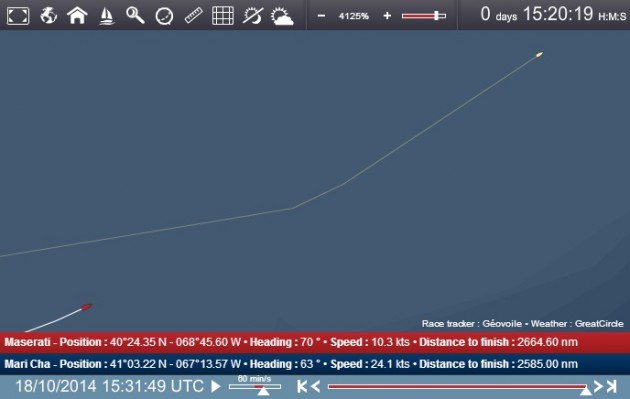 Siamo partiti ieri sera col buio, le prime ore sono state entusiasmanti con ottime condizioni e Maserati è riuscita a dare il meglio di sé planando spesso oltre i 25 nodi di velocità. Nel corso della notte il vento come da previsioni è calato, ma diversamente da quanto annunciato ci è girato in poppa. Abbiamo passato quattro, cinque ore molto difficili con una rotta pessima, poco vento e onde gigantesche quasi di prua. La colpa è dell’uragano Gonzalo che sta arrivando alle Bermuda e ci ha risucchiato tutto il vento.