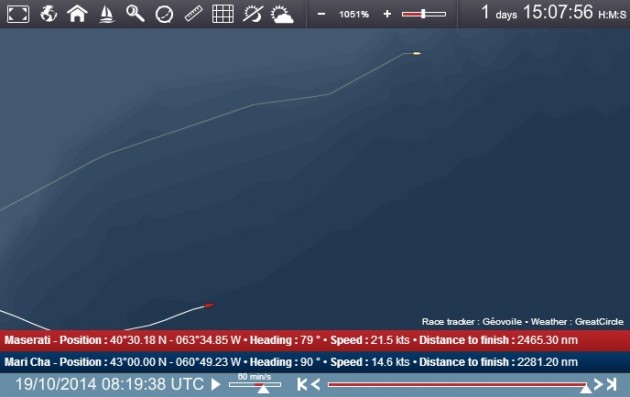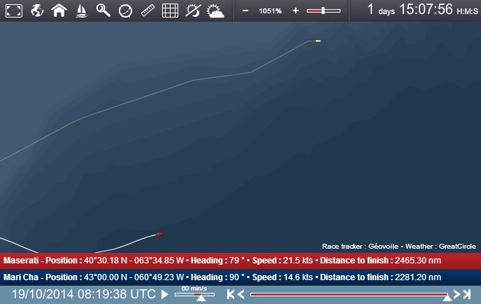 A 24 ore dalla partenza da New York, Maserati è entrata finalmente nel vento, quando mancano 2470 su 2880 miglia a Lizard Point, estremo lembo occidentale dell’Inghilterra e punto di arrivo del record del nord Atlantico.