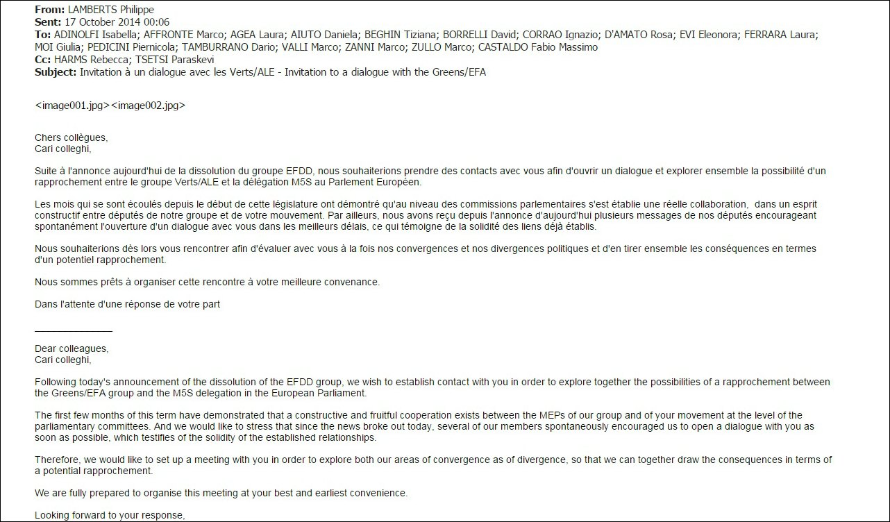 Ecco la mail originale inviata dai Verdi agli eurodeputati M5s: