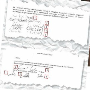 Le righe sono due, proprio due: “Udite le comunicazioni del presidente, relative alla riunione dei capi di Stato e di governo del 23 e 24 ottobre a Bruxelles, le approva”. E che barbosi: scrivono “udite” senza ancora “udire”, pazienza. E no, non c’entra nulla. Di strano ci sono le firme in calce, vergate a penna, più o meno sovrapposte ai nomi di Luigi Zanda (Pd), Maurizio Sacconi (Ncd), Karl Zeller (Svp), Lucio Romano (Pi) e Gianluca Susta (Sc). E non occorre una perizia calligrafica per intuire che le firme sono prodotto di una stessa mano o di mani incerte (e ignote).
