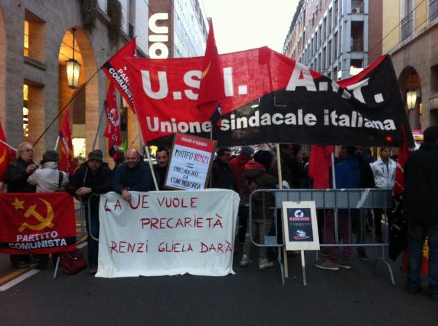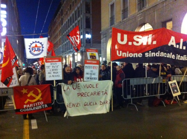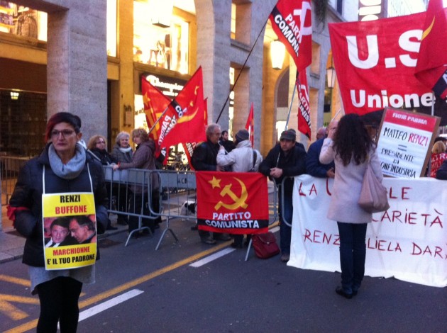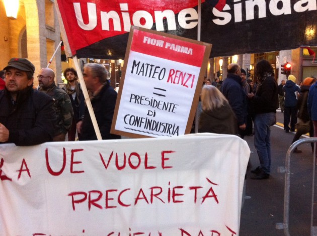 Nel suo tour a Parma nell’agenda del premier non ci sono stati incontri elettorali con il Pd, ma un confronto con i sindaci alluvionati del parmense e soprattutto la visita a tre aziende locali: oltre alla Pizzarotti, la Dallara a Varano Melegari e la Barilla, dove Renzi ha sottoscritto il protocollo sull’alimentazione e la nutrizione in vista dell’Expo. Ma l’attenzione esclusiva alle grandi aziende del territorio è quella che ha innescato la rabbia di sindacati e antagonisti. “Matteo Renzi = presidente di Confindustria”, si leggeva su un cartello della folla di poco più di 60 persone che ha protestato, tenuta a debita distanza dalla piazza del municipio dalle forze dell’ordine. Il presidio si è formato nel primo pomeriggio, ma non era stato annunciato ufficialmente per evitare che fosse bloccato dalla polizia. I manifestanti sono stati fermati a centinaia di metri dal Comune, proprio per evitare che incontrassero il premier, fatto arrivare con l’auto dalla parte opposta rispetto a dove si trovava il gruppo in protesta. In prima fila i sindacati Fiom, Usb e Usi, il centro sociale Sovescio e rappresentanti di Prc, e anche la candidata presidente per le elezioni regionali dell’Altra Emilia Romagna Cristina Quintavalla. “Siamo qui per dire che il Jobs Act e le politiche sul lavoro di questo governo non vanno bene”, spiega Antonella Stasi di Fiom Parma, davanti al presidio con un cartello intorno al collo in cui è scritto: “Matteo Renzi buffone, Marchionne è il tuo padrone”. La manifestazione però è sfociata in lunghi minuti di tensione, quando un gruppo di manifestanti ha tentato di avvicinarsi alla piazza ed è stato caricato dalla polizia in tenuta antisommossa. Un episodio di violenza denunciato da Fiom, che poi ha scelto di togliere le bandiere del sindacato, senza però rinunciare a lanciare accuse su Renzi: “Il premier non è venuto qui per parlare dell’alluvione – ha continuato Stasi – non vuole confrontarsi con i sindacati e i cittadini, ma è qui solo per parlare con i Barilla, i Pizzarotti, i Dallara. Questo la dice tutta”.