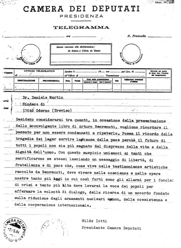 L’allora presidente della Camera dei Deputati, Nilde Iotti, espresse il suo apprezzamento per il volume in una lettera indirizzata al sindaco di Oderzo: “Desidero considerarmi tra quanti, in occasione dello sconvolgente libro di Arturo Benvenuti vogliono ricordare il passato per non essere condannati a ripeterlo. Possa il ricordo della tragedia dei lager servire la causa della pace perchè il futuro di tutti i popoli non sia più segnato dal disprezzo della vita e della dignità dell’uomo. Con questo auspicio uniamoci ai tanti che sacrificarono se stessi lasciando un messaggio di libertà, di fratellanza e di pace che, come vive nelle testimonianze artistiche raccolte da Benvenuti, deve vivere nelle coscienze e nelle opere nostre tanto più oggi in cui così forti sono gli allarmi per i focolai di crisi e tanto più alta deve levarsi la voce dei popoli per affermare la volontà di dialogo, della ricerca di un accordo fondato sulla riduzione degli armamenti nucleari e non, della coesistenza e della cooperazione internazionale”.