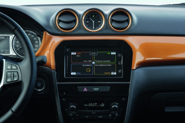 Che la nuova Vitara voglia essere un’auto più attraente e più cittadina della precedente si vede da tanti particolari. Per esempio dal fatto che i cerchi di lega da 17” bruniti sono di serie su tutte le versioni, e che fra le 11 colorazioni per la carrozzeria spuntino 5 abbinamenti bicolori: turchese-nero e arancio-bianco i più estrosi, anche se già visti, praticamente identici, sulla Renault Captur. Agli interni non è stata dedicata altrettanta attenzione, ma comunque rispetto al vecchio modello sono stati fatti grandi passi in avanti: se si deve chiudere un occhio sulle plastiche dure e sui rivestimenti del bagagliaio, ci si può consolare con una plancia razionale e con il sistema multimediale con schermo touch da 7” di serie. E con una dotazione completa a partire dalla versione d’ingresso, quella da 19.900 euro: comprese nel prezzo anche la telecamera posteriore e il climatizzatore automatico.