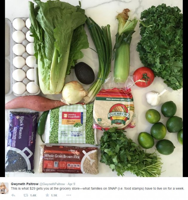 29 dollari a settimana: questa la cifra che Gwyneth Paltrow spenderà per fare la spesa. L’attrice americana ha scelto di sostenere così una campagna di sensibilizzazione contro la fame: l’iniziativa è organizzata dalla ong newyorkese ‘Food Bank’ ed è gestita dallo chef Mario Batali, che ha inviato anche altri personaggi ad unirsi a questa campagna. L’idea, secondo il New York Daily News, è quella di mostrare quanto sia difficile vivere con la somma percepita attualmente con i buoni pasto versati dal governo alle persone a basso reddito. La ong critica il fatto che Congresso degli Stati Uniti abbia tagliato l’importo dei buoni pasto per due volte dal 2013, aumentando il numero di persone che devono fare affidamento ad associazioni di beneficenza per nutrirsi. La Paltrow, per garantire il suo appoggio alla campagna, ha postato sul suo account Twitter una foto dei pochi alimenti che si possono acquistare con 29 dollari a settimana.