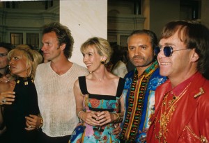 STING with Trudie Styler G. Gianni Versace and Elton John.Versace shop opening. (Credit: Globe-ZUMA ZumaPress retroLaPresse — Only Italy