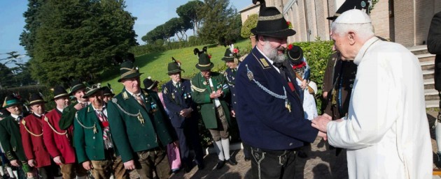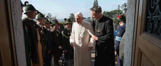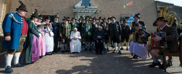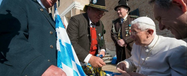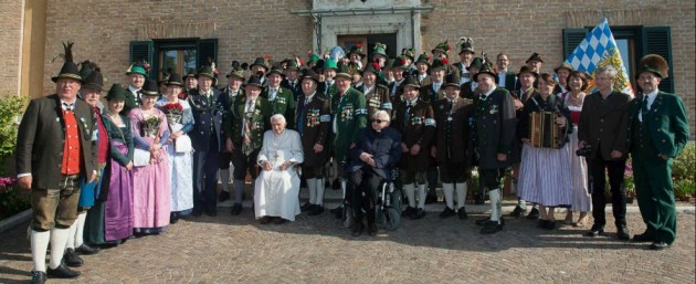 Papa Benedetto XVI compie 88 anni e festeggia in stile bavarese. Nel giorno del suo compleanno Joseph Ratzinger ha ricevuto gli auguri di un gruppo di Gebirgsschützen della Baviera in abiti tradizionali e non si è sottratto ad un brindisi in suo onore con il boccale di birra. Alla festa erano presenti, tra gli altri, il fratello del Papa emerito monsignor Georg Ratzinger e il prefetto della Casa Pontificia monsignor Georg Gaenswein.