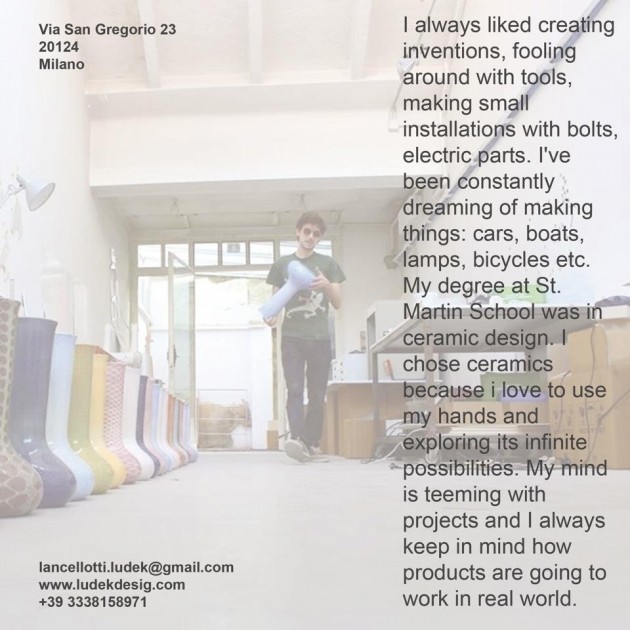 Giovani creativi crescono come Ludek Lancellotti, figlio di principi, di madre artista (Coralla Maiuri), nipote dell’archeologo Amedeo, laureato a pieni voti alla St Martin School in ceramic design, fin da piccolo disfaceva e ricreava i suoi giocattoli. Un monito per le mamme: lasciate pure che i vostri figli li rompano, nelle sue vene potrebbe già scorrere il genio della creatività. Ludek ha esposto i suoi vasi multiformi nell’atelier della stilista Luisa Beccaria, ha reinventato per la stilista i suoi colori da primavera botticelliana.