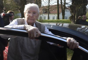 Defendant Oskar Groening arrives for his trial in Lueneburg April 21, 2015. A 93-year-old former bookkeeper at Auschwitz goes on trial in Germany on Tuesday, accused by prosecutors of being an accessory in the murder of 300,000 people, even though he was not involved in any actual killing at the notorious Nazi death camp. The trial of Groening, who was 21 and by his own admission an enthusiastic Nazi when he was sent to Auschwitz in 1942, may turn out to be one of the last big Holocaust trials because so few Nazis suspected of committing crimes during World War Two are still alive. REUTERS/Fabian Bimmer