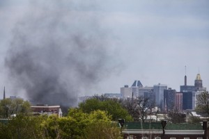 WASHINGTON, USA – APRIL 27: Smoke from a burning car set on fire by protestors rises over the Baltimore skyline during riots in Baltimore, USA on April 27, 2015. Protests following the death of Freddie Gray from injuries suffered while in police custody have turned violent with people throwing debris at police and media and burning cars and businesses. Samuel Corum / Anadolu Agency