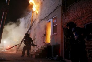 Baltimore firefighters fight a fire inside a burning building set ablaze by rioters on East Biddle street during clashes after the funeral of Freddie Gray in Baltimore, Maryland in the early morning hours of April 28, 2015. Baltimore erupted in violence as hundreds of rioters looted stores, burned buildings and injured at least 15 police officers following the funeral of Gray, a 25-year-old black man who died after he was injured in police custody. REUTERS/Jim Bourg TPX IMAGES OF THE DAY