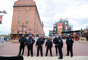 Apr 27, 2015; Baltimore, MD, USA; Baltimore police officers stand outside the stadium prior to the cancellation of the game between the Chicago White Sox and Baltimore Orioles at Oriole Park at Camden Yards. Mandatory Credit: Evan Habeeb-USA TODAY Sports