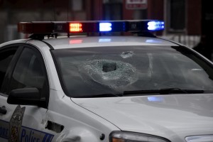 A police car travels on Pennsylvania Avenue in Baltimore April 27, 2015. Hundreds of rioters looted businesses and set buildings on fire in Baltimore on Monday in widespread violence that injured at least 15 police officers following the funeral of Freddie Gray, a 25-year-old black man who died after he was injured in police custody. REUTERS/Sait Serkan Gurbuz