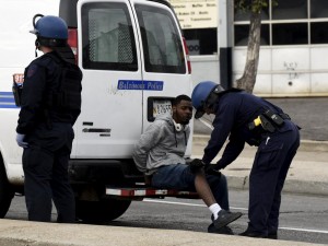 A law enforcement officer attends to a detained protester on Reisterstown Road in Baltimore April 27, 2015. Hundreds of rioters looted businesses and set buildings on fire in Baltimore on Monday in widespread violence that injured at least 15 police officers following the funeral of Freddie Gray, a 25-year-old black man who died after he was injured in police custody. REUTERS/Sait Serkan Gurbuz