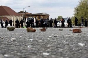 Bricks thrown by protests lie on Reisterstown Road in Baltimore April 27, 2015. Hundreds of rioters looted businesses and set buildings on fire in Baltimore on Monday in widespread violence that injured at least 15 police officers following the funeral of Freddie Gray, a 25-year-old black man who died after he was injured in police custody. REUTERS/Sait Serkan Gurbuz