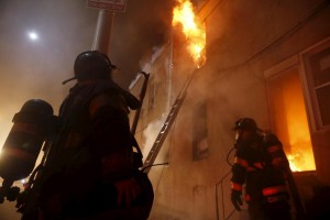 Baltimore fire fighters attack a fire set by rioters in a convenience store and residence on East Biddle street set ablaze by rioters during clashes after the funeral of Freddie Gray in Baltimore, Maryland in the early morning hours of April 28, 2015. Baltimore erupted in violence as hundreds of rioters looted stores, burned buildings and injured at least 15 police officers following the funeral of a 25-year-old black man who died after he was injured in police custody. REUTERS/Jim Bourg